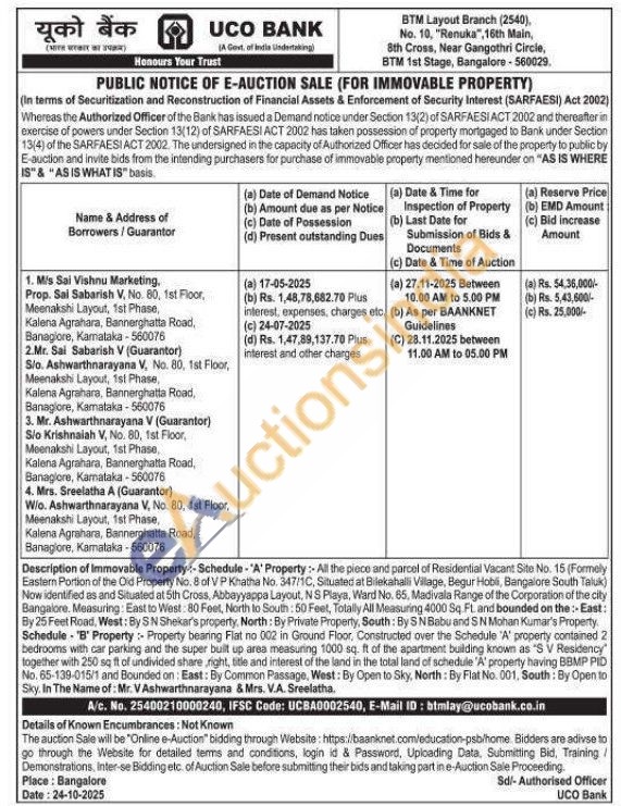Description of Immovable Property:-Schedule-'A' Property: All the piece and parcel of Residential Vacant Site No. 15 (Formely Eastern Portion of the Old Property No. 8 of VP Khatha No. 347/1C, Situated at Bilekahalli Village, Begur Hobli, Bangalore South Taluk) Now identified as and Situated at 5th Cross, Abbayyappa Layout, NS Playa, Ward No. 65. Madivala Range of the Corporation of the city Bangalore. Measuring: East to West: 80 Feet, North to South: 50 Feet, Totally All Measuring 4000 Sq. Ft. and bounded on the :- East: By 25 Feet Road, West: By SN Shekar's property, North: By Private Property, South: By SNBabu and SN Mohan Kumar's Property. Schedule 'B' Property: Property bearing Flat no 002 in Ground Floor, Constructed over the Schedule 'A' property contained 2 bedrooms with car parking and the super built up area measuring 1000 sq. ft of the apartment building known as "S V Residency" together with 250 sq ft of undivided share right, title and interest of the land in the total land of schedule 'A' property having BBMP PID No. 65-139-015/1 and Bounded on: East: By Common Passage, West: By Open to Sky, North: By Flat No. 001, South: By Open to Sky. In The Name of: Mr. V Ashwarthnarayana & Mrs. V.A. Sreelatha,