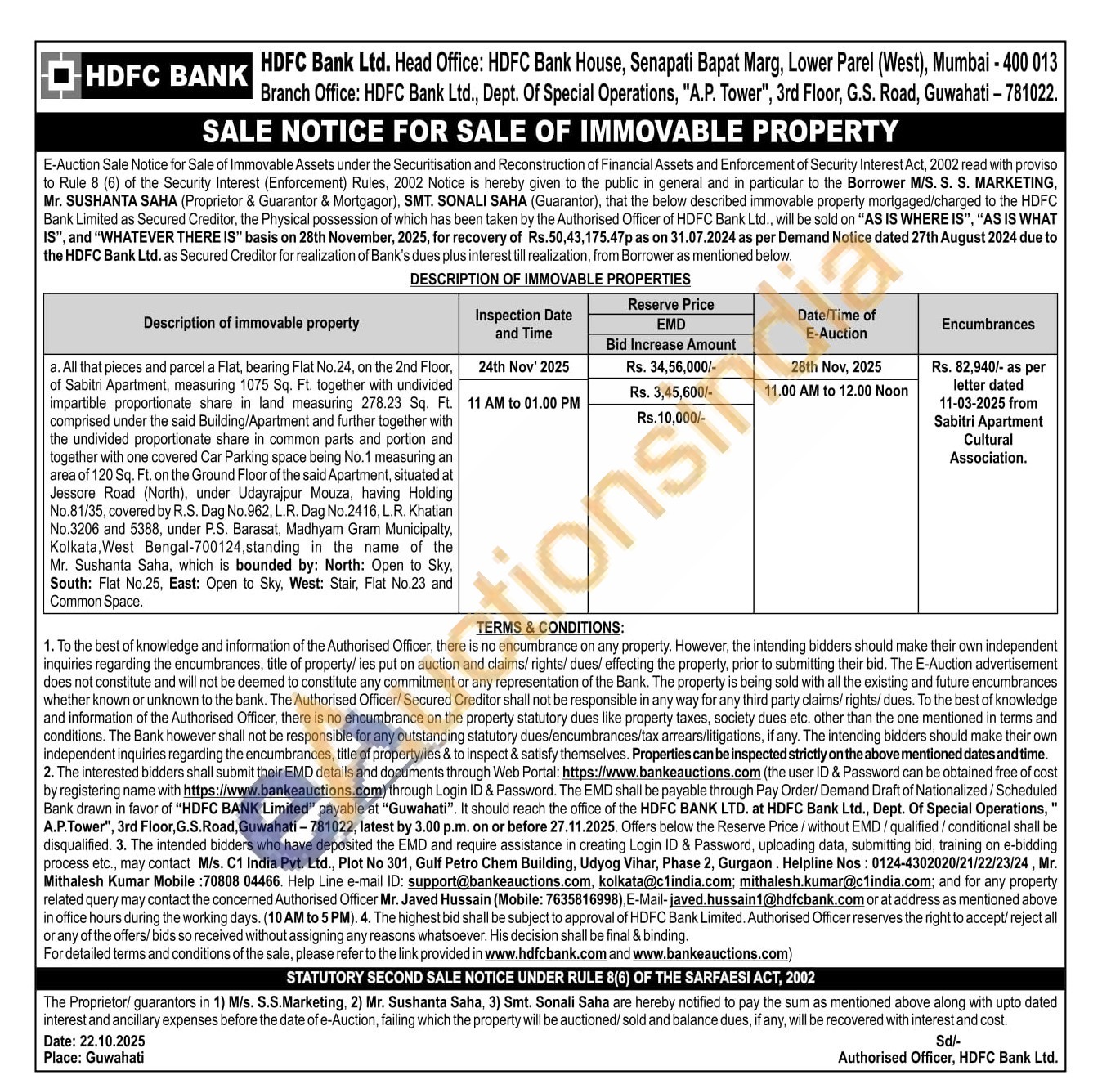 a. All that pieces and parcel a Flat, bearing Flat No.24, on the 2nd Floor, of Sabitri Apartment, measuring 1075 Sq. Ft. together with undivided impartible proportionate share in land measuring 278.23 Sq. Ft. comprised under the said Building/Apartment and further together with the undivided proportionate share in common parts and portion and together with one covered Car Parking space being No.1 measuring an area of 120 Sq. Ft. on the Ground Floor of the said Apartment, situated at Jessore Road (North), under Udayrajpur Mouza, having Holding No.81/35, covered by R.S. Dag No.962, L.R. Dag No.2416, L.R. Khatian No.3206 and 5388, under P.S. Barasat, Madhyam Gram Municipalty, Kolkata, West Bengal-700124, standing in the name of the Mr. Sushanta Saha, which is bounded by: North: Open to Sky, South: Flat No.25, East: Open to Sky, West: Stair, Flat No.23 and Common Space.
