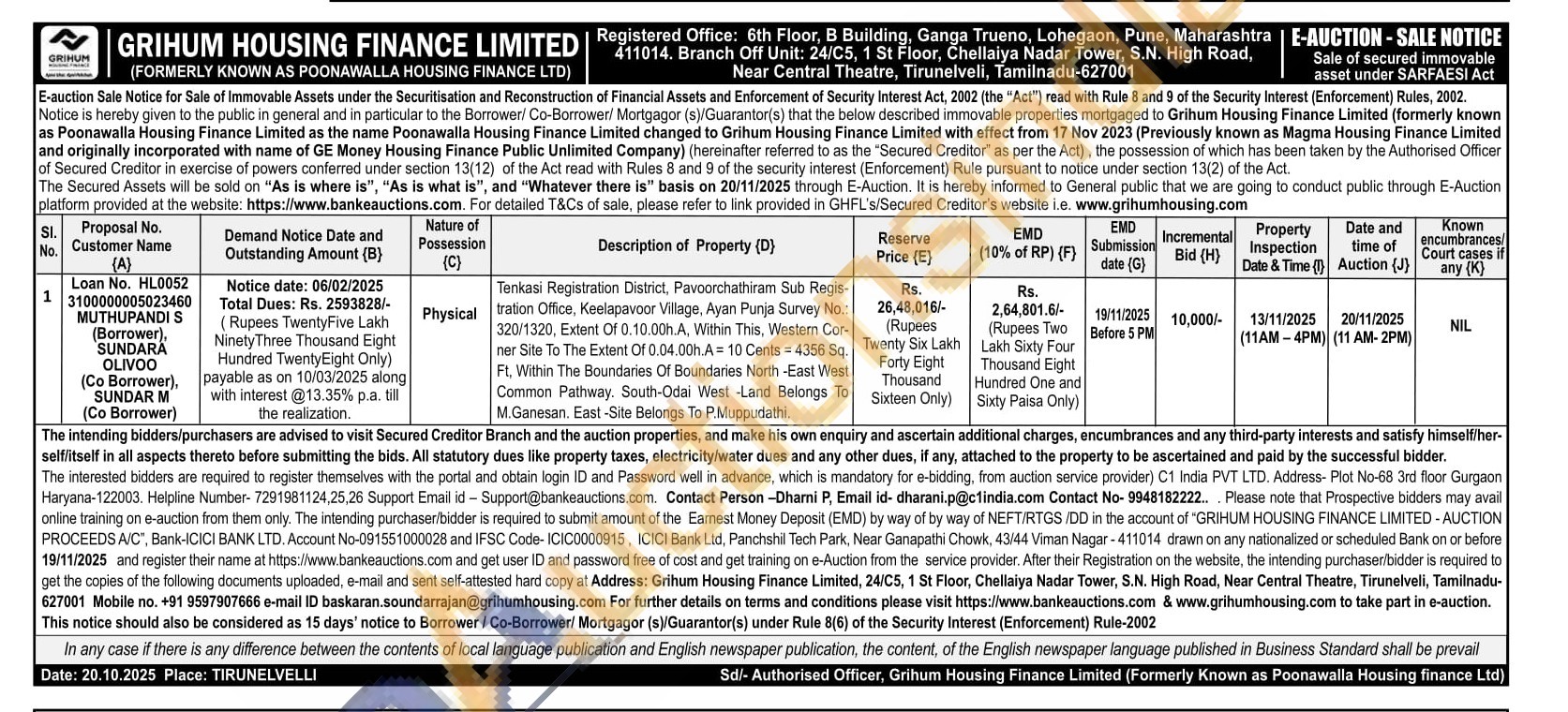Tenkasi Registration District, Pavoorchathiram Sub Regis-tration Office, Keelapavoor Village, Ayan Punja Survey No.: 320/1320, Extent Of 0.10.00h.A, Within This, Western Cor-ner Site To The Extent Of 0.04.00h.A= 10 Cents = 4356 Sq. Ft. Within The Boundaries Of Boundaries North-East West Common Pathway. South-Odai West -Land Belongs To M.Ganesan. East-Site Belongs To P.Muppudathi
