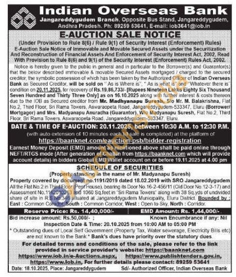 Property covered by document no.1191/2019 dated 18.02.2019 with SRO Jangareddygudem All the Flat No.2 in Third Floor (Pent House), bearing is Door No. 16-2-456/11 (Old Door No. 12-3-17) and Assessment No. 1142010263 and 1060 Sq.feet in "Sri Rama Towers along with 38 Sq.yds of undivided share of site in R.S. No.346 siluated at Jangareddygudem Municipality, Eluru District Bounded by: East: Common Corridor, South: Common Corridor, West: Open to Sky, North Corridor
