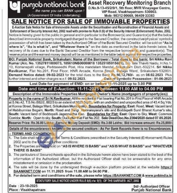 Property in the name of Sri N.Ravikumar: All the residential Flat bearing Flat No. 201 in First Floor of HNR Arcade at S.No.42, T.S.No.882/2, 882/3 to an extent of 1025 Sq.Ft., with an undivided and unspecified area of 43.4 Sq. Yds. at Konna Street, Balaga Ward, Srikakulam Municipality. Boundaries for Property: East: Road, West: Vacant land of Habibunnisa Begam, North: Road and Tangi Harinarayana's site and Boddepalli Sunil Bharat Kumar's site, South: Vacant land of Boddepalli Jagannadha Rao. Boundaries for Flat: East: Open to Sky, West: Common Corridor, North: Open to sky, South: Duct after that Flat No.202. Sale Deed Doc. No.2304/2020 dated 07.05.2020