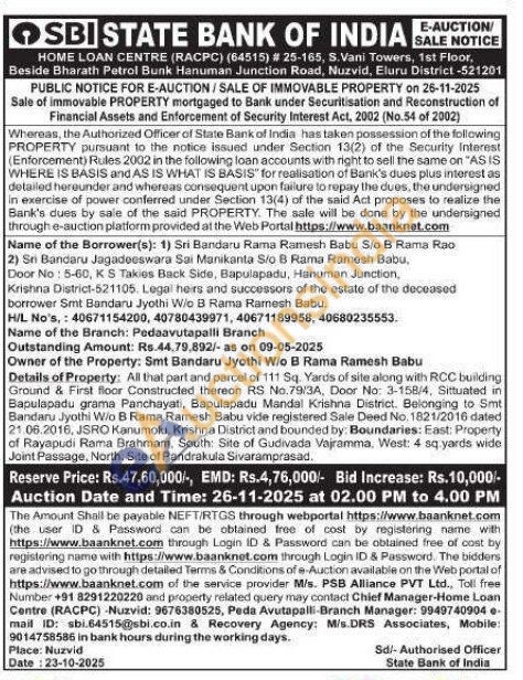 All that part and parcel of 111 Sq. Yards of site along with RCC building Ground & First floor Constructed thereon RS No.79/3A, Door No: 3-158/4, Sittuated in Bapulapadu grama Panchayati, Bapulapadu Mandal Krishna District. Belonging to Smt Bandaru Jyothi W/o B Rama Ramesh Babu vide registered Sale Deed No. 1821/2016 dated 21.06.2016, JSRO Kanumolu, Krishna District and bounded by: Boundaries: East: Property of Rayapudi Rama Brahmam, South: Site of Gudivada Vajramma. West: 4 sq yards wide Joint Passage, North: Site of Pandrakula Sivaramprasad