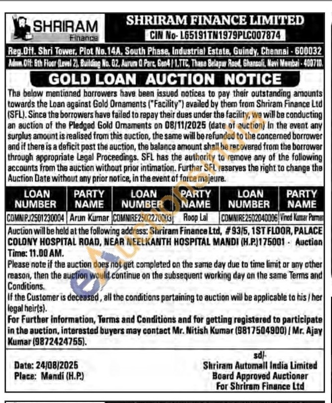Shriram Finance Ltd Gold Auctions Auction in Mandi
