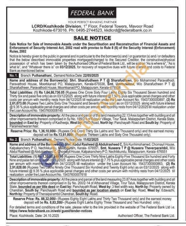 Description of immovable property: All the piece and parcel of the land measuring 23.87 Ares together with building and all other improvements thereon comprised in Sy No. 200/2-14 of Athavanad Village, Tirur Taluk, Malappuram District, Kerala Stale, bounded as per title deed on East by: Panchayath Road, West by: 3 feet width way, North by: Property owned by Chandran, South by: Panchayath Road and bounded as per location sketch on East by: Road, West by: Edavazhi, North by: Property of Thenaiparambil Chandran, South by: Road.