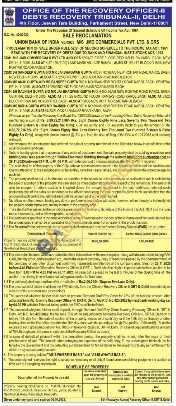 Property bearing plot/khasra no. 150/79, Municipal No. XIV/11163-2, Block-D, measuring 373 sq, yards, situated at New Rohtak Road, Karol Bagh, New Delhi