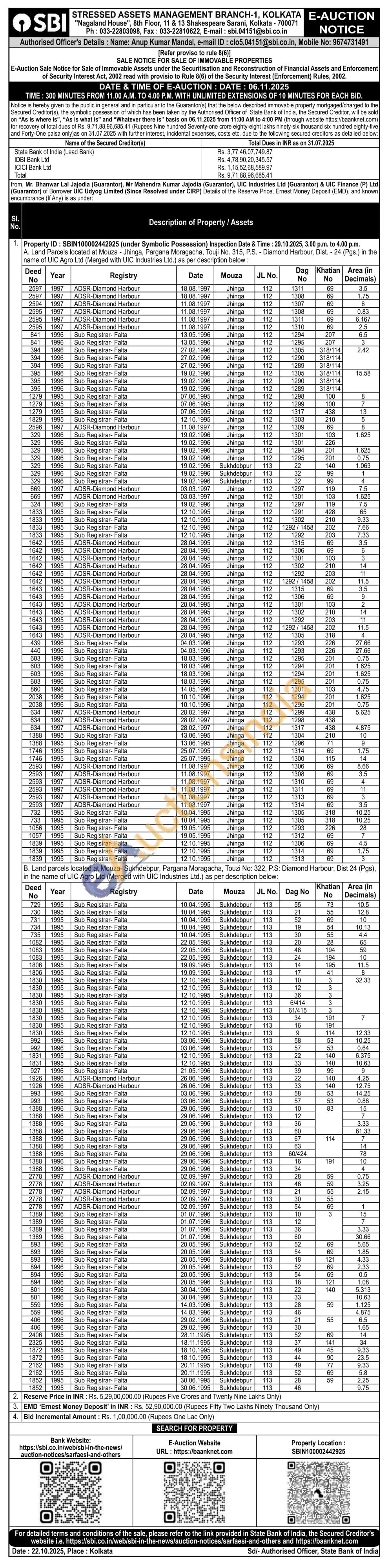 B. Land parcels located at Mouza- Sukhdebpur, Pargana Moragacha, Touzi No: 322, P.S: Diamond Harbour, Dist 24 (Pgs), in the name of UIC Agro Ltd (Merged with UIC Industries Ltd.) as per description below: