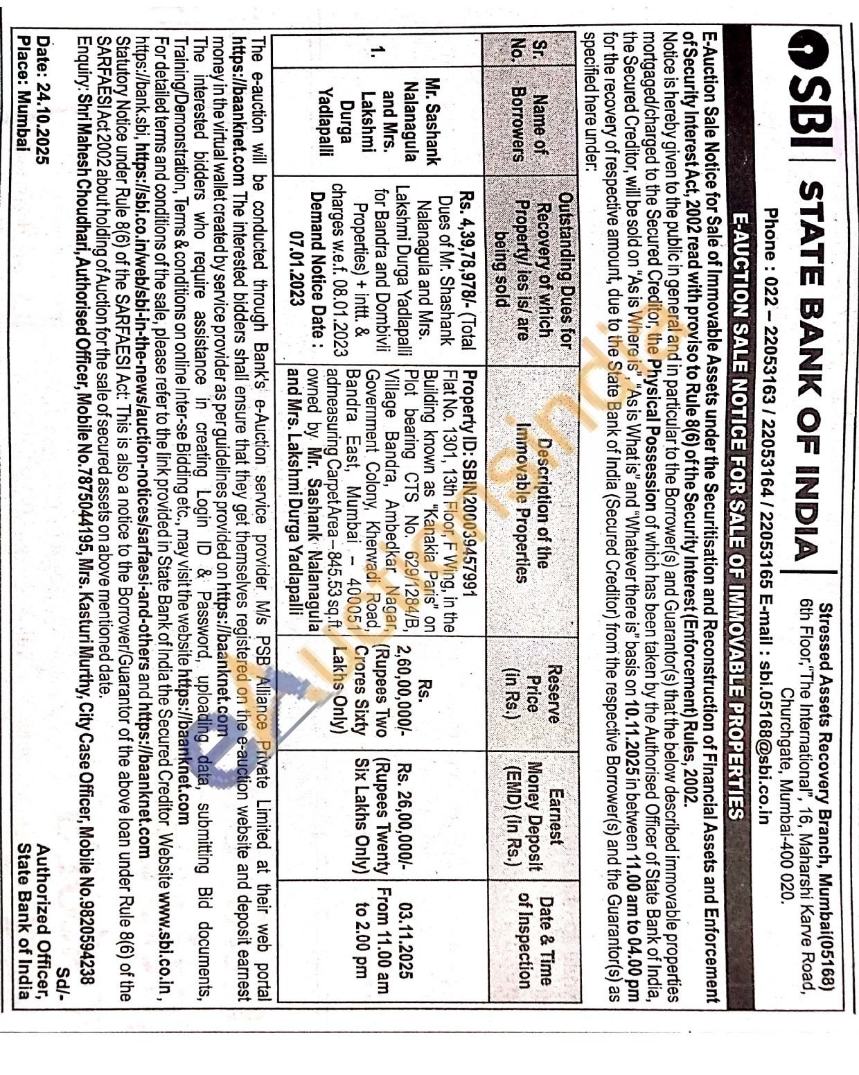Mahesh Choudhari, Authorised Officer, Mobile No. 7875044195, Mrs. Kasturi Murthy, City Case Officer, Mobile No.9820594238