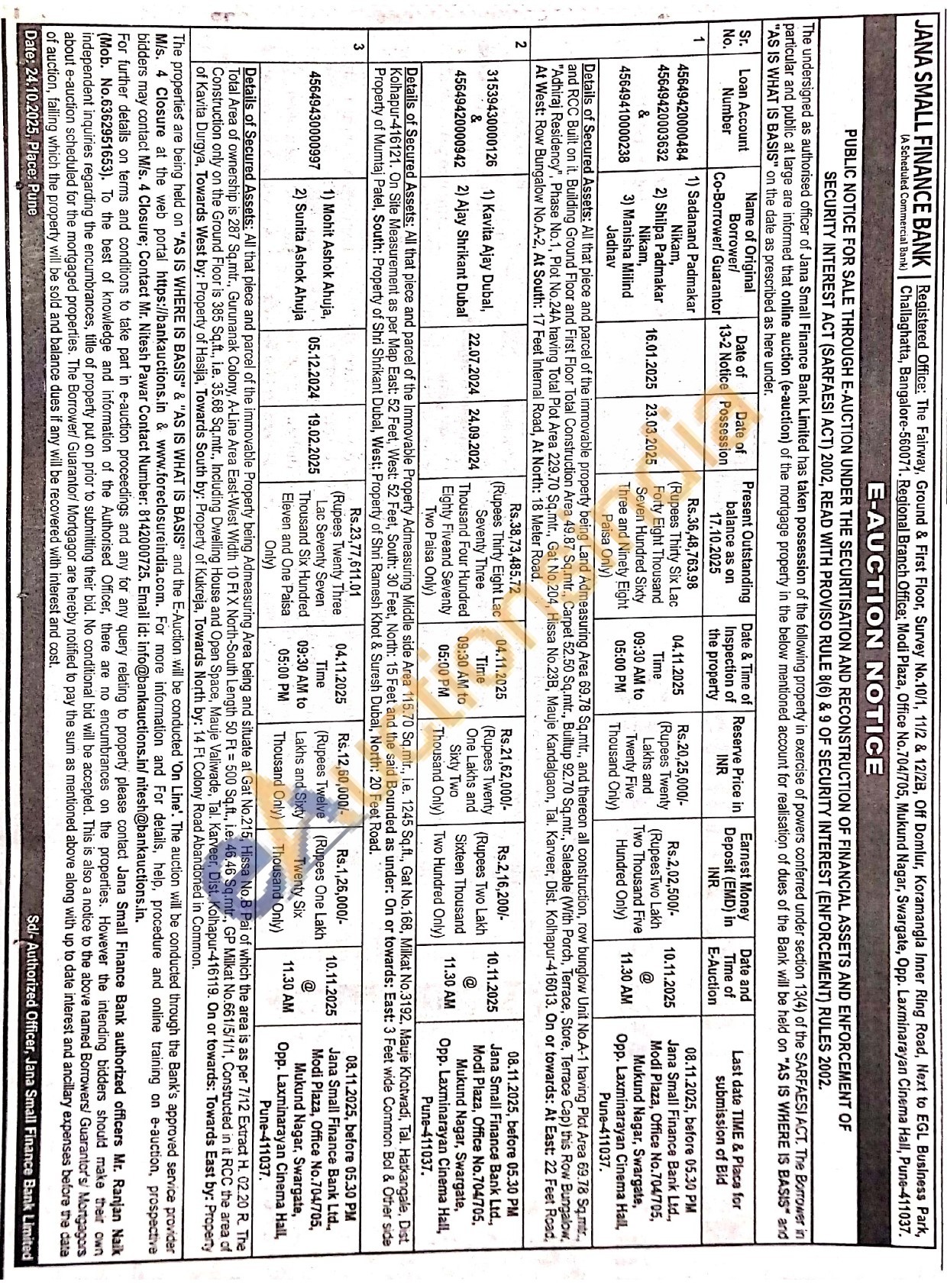 Details of Secured Assets: All that plece and parcel of the immovable Property being Admeasuring Area being and situate at Gat No.215, Hissa No.B Pai of which the area is as per 7/12 Extract H. 02.20 R. The Total Area of ownership is 287 Sq.mtr., Gurunanak Colony, A-Line Area East-West Width 10 Ft X North-South Length 50 Ft = 500 Sq.ft., i.e. 46.46 Sq.mtr., GP Milkat No.661/5/1/1, Constructed in it RCC the area of Construction only on the Ground Floor is 385 Sq.ft., i.e. 35.68 Sq.mtr., Including Dwelling House and Open Space, Mauje Valiwade, Tal. Karveer, Dist. Kolhapur-416119. On or towards: Towards East by: Property of Kavita Durgya, Towards West by: Property of Hasija, Towards South by: Property of Kukreja, Towards North by: 14 Ft Colony Road Abandoned in Common.