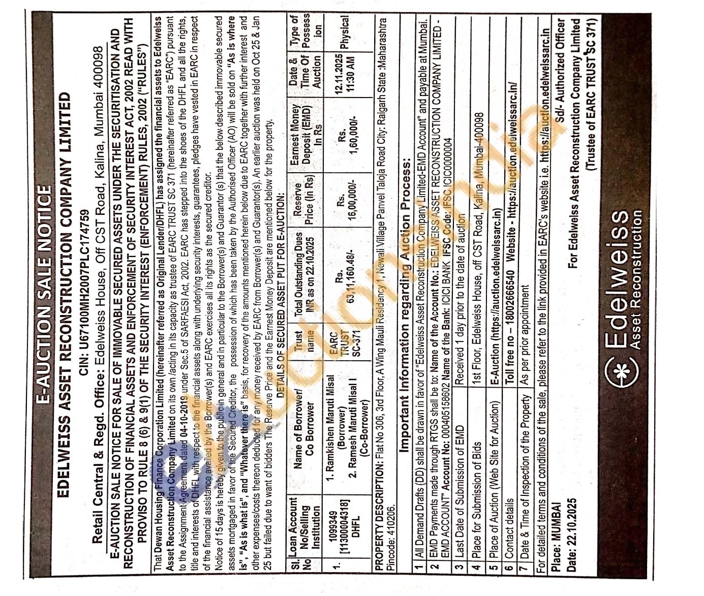 PROPERTY DESCRIPTION: Flat No 306, 3rd Floor, A Wing Mauli Residency 1, Newali Village Panvel Taloja Road City: Raigarh State :Maharashtra Pincode: 410206.