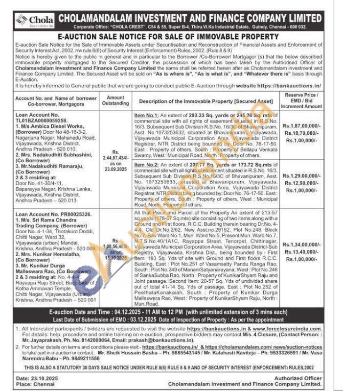 Item No.1: An extent of 293.33 Sq. yards or 245.26 Sq. mts of commercial site with all rights of easement situated in R.S.No. 16/3, Subsequent Sub Division R.S.No. 16/3C of Bhavanipuram, Asst. No. 1073253632, situated at Bhavanipuram, Vijayawada, Vijayawada Municipal Corporation Area, Vijayawada District Registrar, NTR District being bounded by: Door No. 76-17-50. East Property of others, South Property of Bellapu Venkata Swamy, West Municipal Road, North Property of others