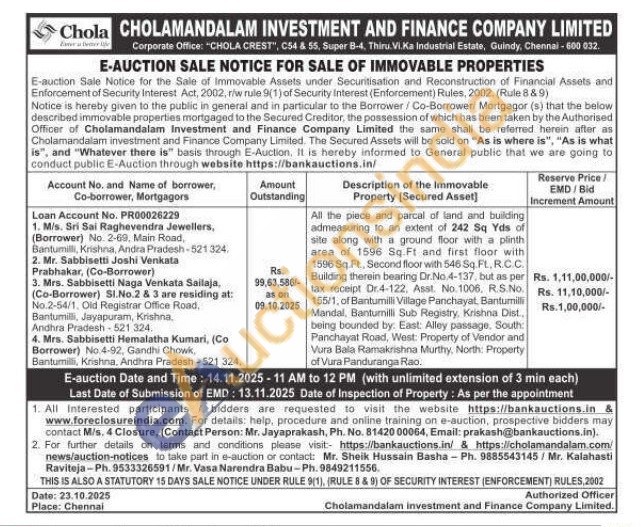 All the piece and parcel of land and building admeasuring to an extent of 242 Sq Yds of site along with a ground floor with a plinth area of 1596 Sq.Ft and first floor with 1596 Sq. Ft., Second floor with 546 Sq. FL., R.C.C. Building therein bearing Dr.No.4-137, but as per tax receipt Dr.4-122, Asst. No. 1006, R.S.No. 155/1, of Bantumilli Village Panchayat, Bantumilli Mandal, Bantumilli Sub Registry, Krishna Dist. being bounded by: East: Alley passage, South: Panchayat Road, West: Property of Vendor and Vura Bala Ramakrishna Murthy, North: Property of Vura Panduranga Rao.