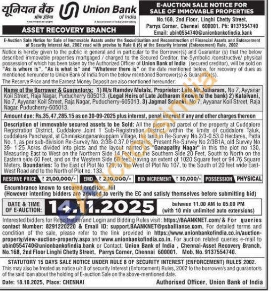 All the piece and parcel of the property at Cuddalore Registration District, Cuddalore Joint 1 Sub-Registration District, within the limits of cuddalore Taluk, cuddalore Panchayat, at Chinnakanganankuppam Village, the land in Re-Survey No 2/3-0.53.0 Hectares, Patta No. 1, as per sub-division Re-Survey No. 2/38-0.37.0 Hectares, Present Re-Survey No 2/3B1A, old Survey No 39- 1.25 Acres divided into plots and the layout named as "Ganapathy Nagar" in this the plot no 130, Measuring East to West on the Northern Side 14 Feet, on the Southern Side 20 Feet, South to North on the Eastern side 60 Feet, and on the Western Side 60 feet, Having an extent of 1020 Square feet or 94.76 Square Meters. Boundaries: To the East of Plot No 129, to the West of Plot No 107, to the South of 20 feet wide East-