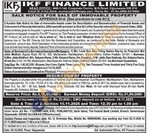 The Property is situated within the jurisdiction of Krishna District Machilipatnam Sub-Registrer, Machilipatnam Town, Machavaram, Municipal ward No. 15, D.No. 15/155, R.S. No. 359 which is an extent of 3363 Sq, yards or 2811 Sq. Meters open site is bounded by: East: R.S. No. 26788 feet, South: Property of B- Schedule 336 feet, West: 40 feet width Municipal Road 88 feel, North: Property of D-Schedule 352 feet.