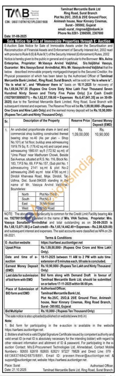 An undivided proportionate share in land and commercial shop building constructed thereat bearing shop no.40 (As per plan Shop No. 101) at 1st floor, buildup area admeasuring 1919.79 Sq. ft. (178.42 sq.mf) and carpet area admeasuring 1860.61 sq.ft (172.92 sq.mt) of "Uma Plaza" near Madhuram Chowk, Beside Sai Avenue, situated at R.S. No. 116, Block No. 183, TP.S No. 69, F.P No. 157, (Sub plot No. 1 admeasuring 2141 sq.mt & plot No-2 admeasuring 2645 sq.mt total 4786 sq.mt) Dindoli Kharvasa Road, Moje. Dindoli, Tal. Udhna, Dist. Surat-394305 standing in the name of Mr. Vasoya Arvind Valjibhai.