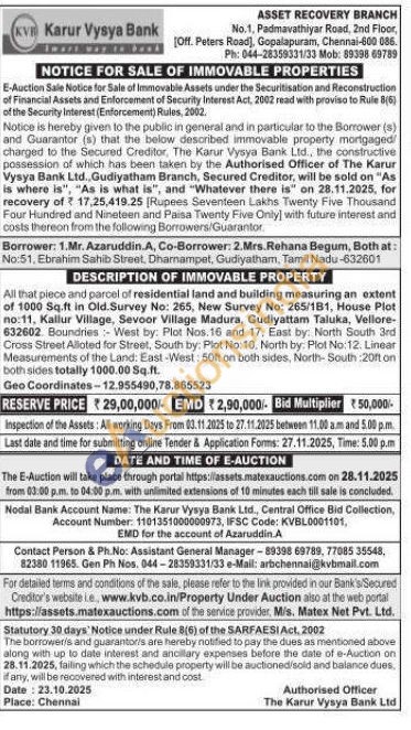 All that piece and parcel of residential land and building measuring an extent of 1000 Sq.ft in Old.Survey No: 265, New Survey No: 265/181, House Plot no:11, Kallur Village, Sevoor Village Madura, Gudiyattam Taluka, Vellore-632602 Boundries: West by: Plot Nos. 16 and 17. East by: North South 3rd Cross Street Alloted for Street, South by: Plot No: 10. North by: Plot No:12. Linear Measurements of the Land: East-West: 50ft on both sides, North-South: 20ft on both sides totally 1000.00 Sq.ft.