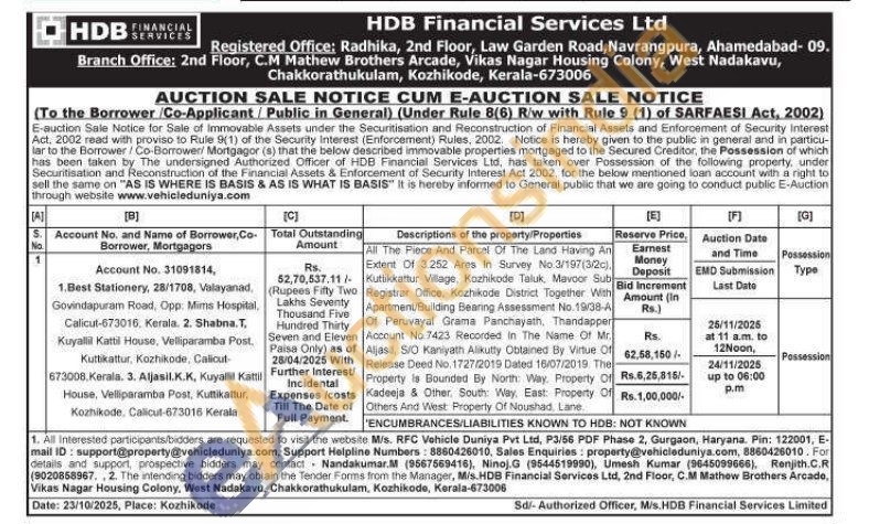 All The Piece And Parcel Of The Land Having An Extent Of 3.252 Ares In Survey No: 3/197(3/20), Kuttikkattur Village, Kozhikode Taluk, Mavoor Sub Registrar Office, Kozhikode District Together With Apartment/Building Bearning Assessment No. 19/38-A Of Peruvayal Grama Panchayath, Thandapper Account No. 7423 Recorded In The Name Of Mr. Aljasil S/O Kaniyath Alikutty Obtained By Virtue Of Release Deed No. 1727/2019 Dated 18/07/2019 The Property is Bounded By North: Way. Property Of Kadeeja & Other. South: Way, East: Property Of Others And West Property Of Noushad Lane.