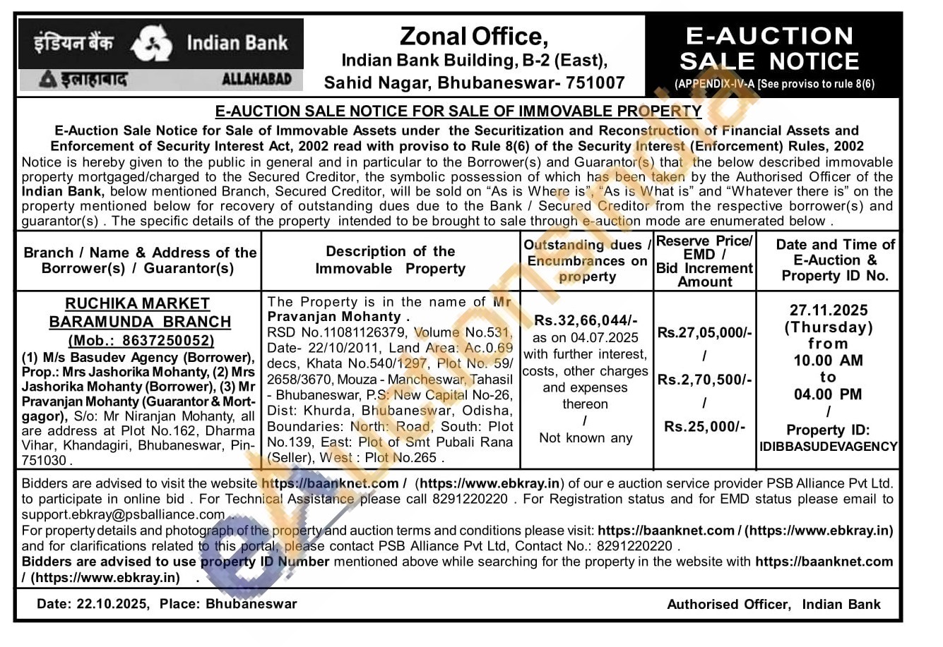 The Property is in the name of Mr Pravanjan Mohanty. RSD No.11081126379, Volume No.531, Date- 22/10/2011, Land Area: Ac.0.69 decs, Khata No.540/1297, Plot No. 59/2658/3670, ΜMouza - Mancheswar, Tahasil - Bhubaneswar, P.S: New Capital No-26, Dist: Khurda, Bhubaneswar, Odisha, Boundaries: North: Road, South: Plot No.139, East: Plot of Smt Pubali Rana (Seller), West: Plot No.265