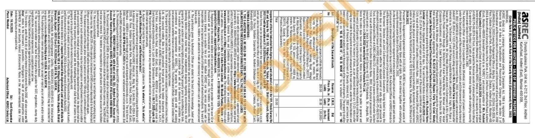 Industrial Stone Quarry type property at Moje Razalwada (Non-Agricultural Land) situated at Khata No 108, Block Survey No 60, admeasuring 13557 sq. meters, Nr Razałwada Patiya, Rajpardi Netrang Road, Village Rajahwada, Taluka Jhagadia, District Bharuch-393115. Gujarat, in the rivo Mis. Rashmi Products Private Limited (Guarantor). And Industrial Stone Quarry type property at Moje Razalwada (Non-Agricultural Land) situated at Block Survey No 102 & 103, admeasuring 14669 sq. meters, Nr Razalwada Patiya, Rajpardi-Netrang Road, Village Rajalwada, Taluka Jhagadia, District Bharuch-393115, Gujarat, in the no Mis. Rashmi Products Private Limited (Guarantor).