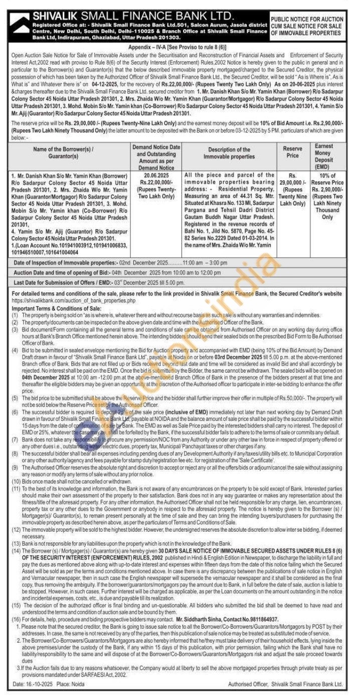 All the piece and parcel of the immovable properties bearing address: Residential Property, Measuring an area of 44.31 Sq. Mtr. Situated at Khasra No. 133 MI, Sadarpur Pargana and Tehsil Dadri District Gautam Buddh Nagar Uttar Pradesh. Registered in the revenue records of Bahi No. 1, Jild No. 5870, Page No. 45-82 Series No.2229 Dated 01-03-2014. In the name of Mrs. Zhaida W/o Mr. Yamin