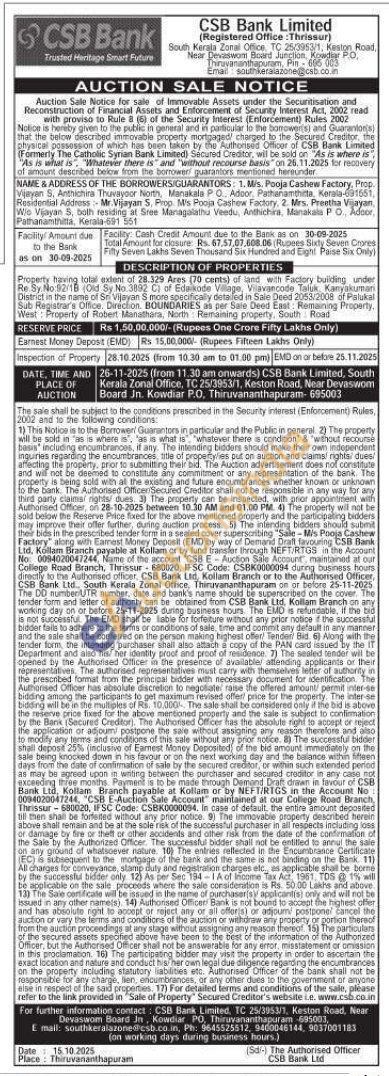 Property having total extent of 28.329 Ares (70 cents) of land with Factory building under Re Sy. No:92/18 (Old Sy No. 3892 C) of Edaikode Village, Vilavancode Taluk, Kanyakumari District in the name of Sn Vijayan S more specifically detailed in Sale Deed 2053/2008 of Palukal Sub Registrar's Office. Direction. BOUNDARIES as per Sale Deed East: Remaining Property. West: Property of Robert Manathara, North Remaining property, South Road
