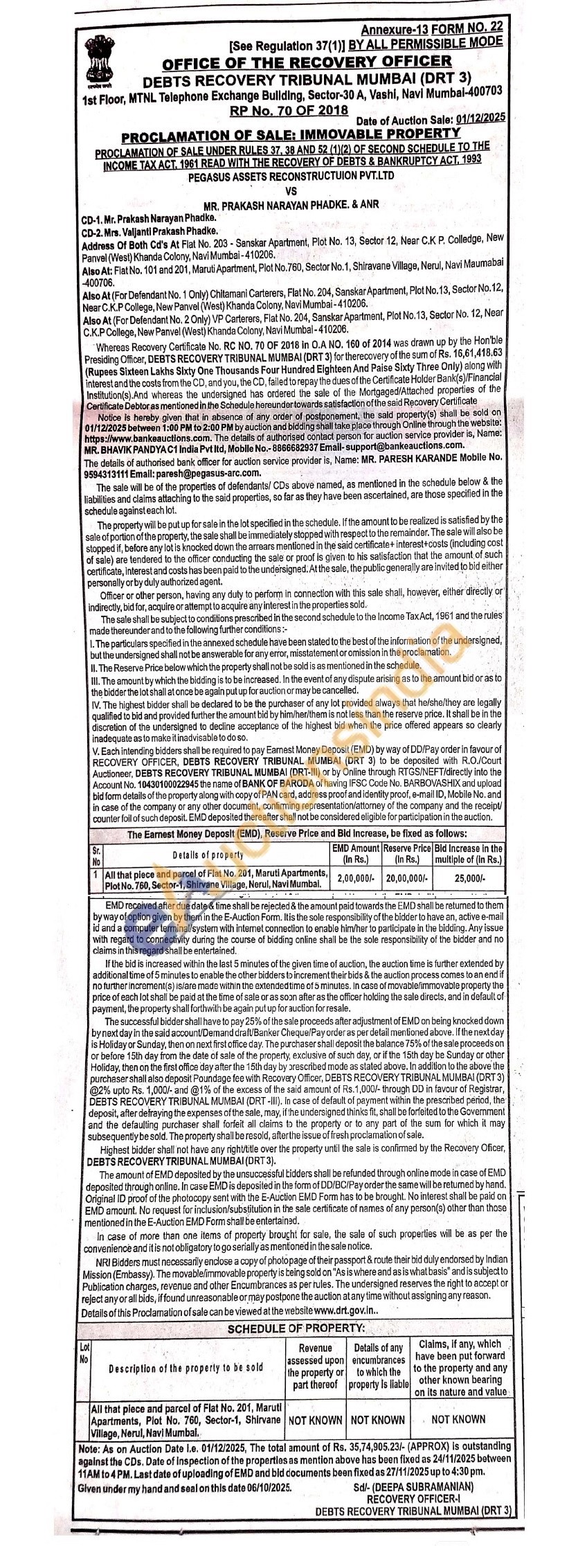 All that piece and parcel of Flat No. 201, Maruti Apartments, Plot No. 760, Sector-1, Shirvane Village, Nerul, Navi Mumbal.