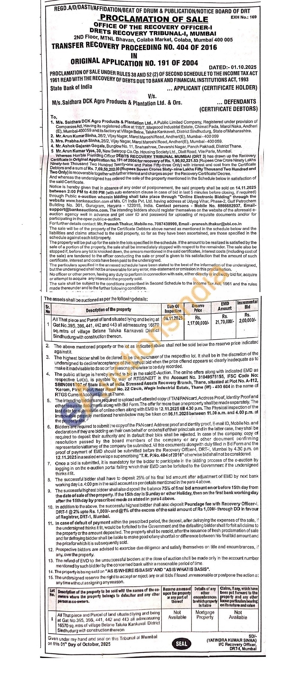 All That piece and Parcel of land situated lying and being at Gat No.395, 396, 441, 442 and 443 all admeasuring 16570 sq.mtrs of village Belane Taluka Kankavali District Sindhudurg with construction thereon.