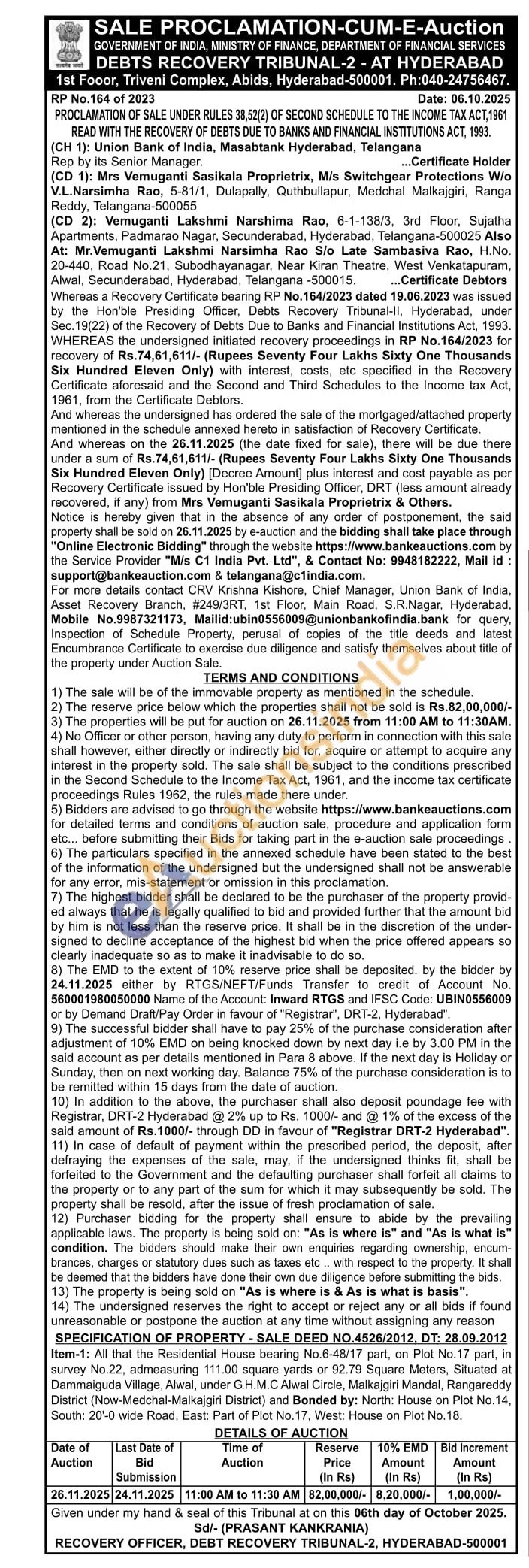 Item-1: All that the Residential House bearing No.6-48/17 part, on Plot No.17 part, in survey No.22, admeasuring 111.00 square yards or 92.79 Square Meters, Situated at Dammaiguda Village, Alwal, under G.H.M.C Alwal Circle, Malkajgiri Mandal, Rangareddy District (Now-Medchal-Malkajgiri District) and Bonded by: North: House on Plot No. 14, South: 20'-0 wide Road, East: Part of Plot No.17, West: House on Plot No. 18