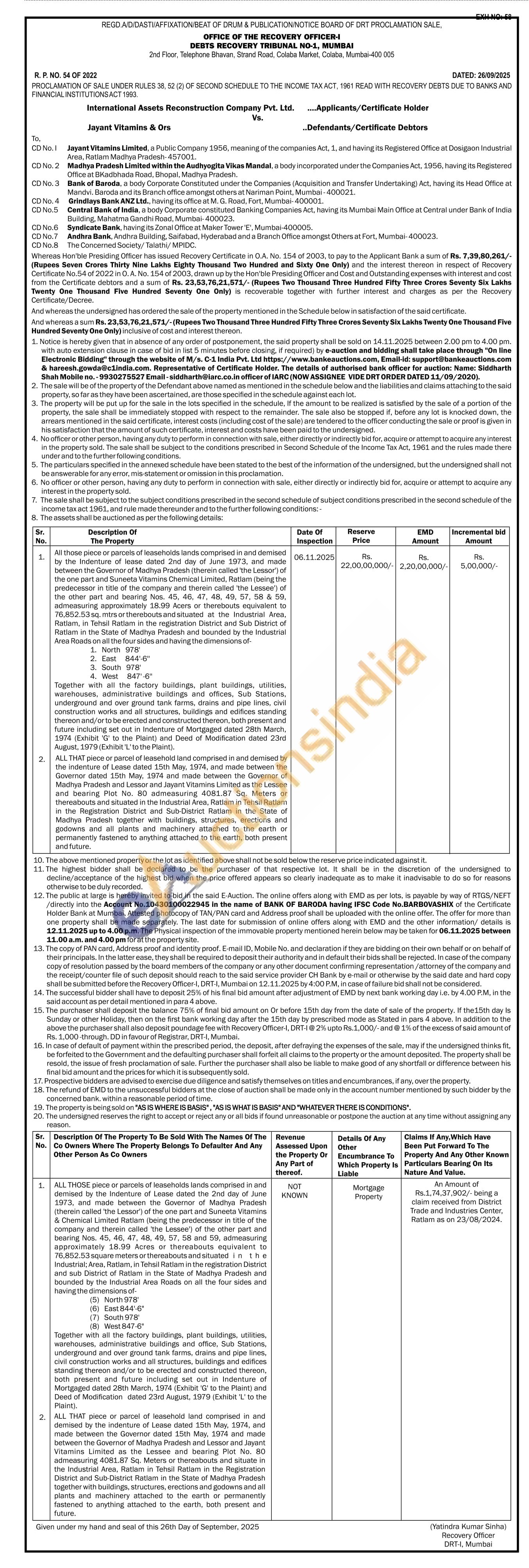 All those piece or parcels of leaseholds lands comprised in and demised by the Indenture of lease dated 2nd day of June 1973, and made between the Governor of Madhya Pradesh (therein called 'the Lessor') of the one part and Suneeta Vitamins Chemical Limited, Ratlam (being the predecessor in title of the company and therein called 'the Lessee') of the other part and bearing Nos. 45, 46, 47, 48, 49, 57, 58 & 59, admeasuring approximately 18.99 Acers or therebouts equivalent to 76,852.53 sq. mtrs or therebouts and situated at the Industrial Area, Ratlam, in Tehsil Ratlam in the registration District and Sub District of Ratlam in the State of Madhya Pradesh and bounded by the Industrial Area Roads on all the four sides and having the dimensions of-