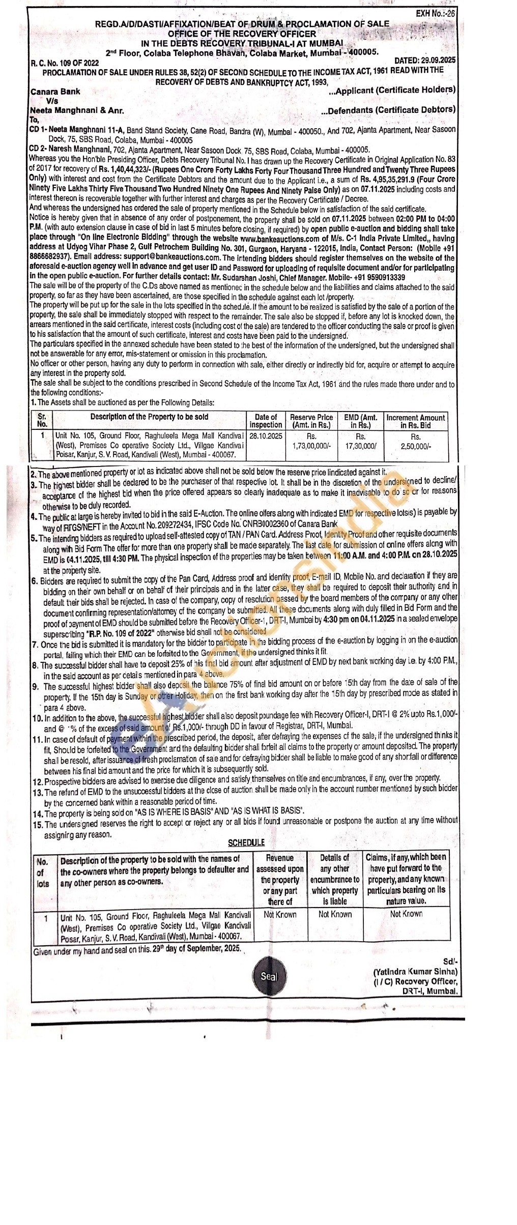 Unit No. 105, Ground Floor, Raghuleela Mega Mall Kandival (West), Premises Co operative Society Ltd., Villgae Kandivai Poisar, Kanjur, S. V. Road, Kandivali (West), Mumbai - 400067
