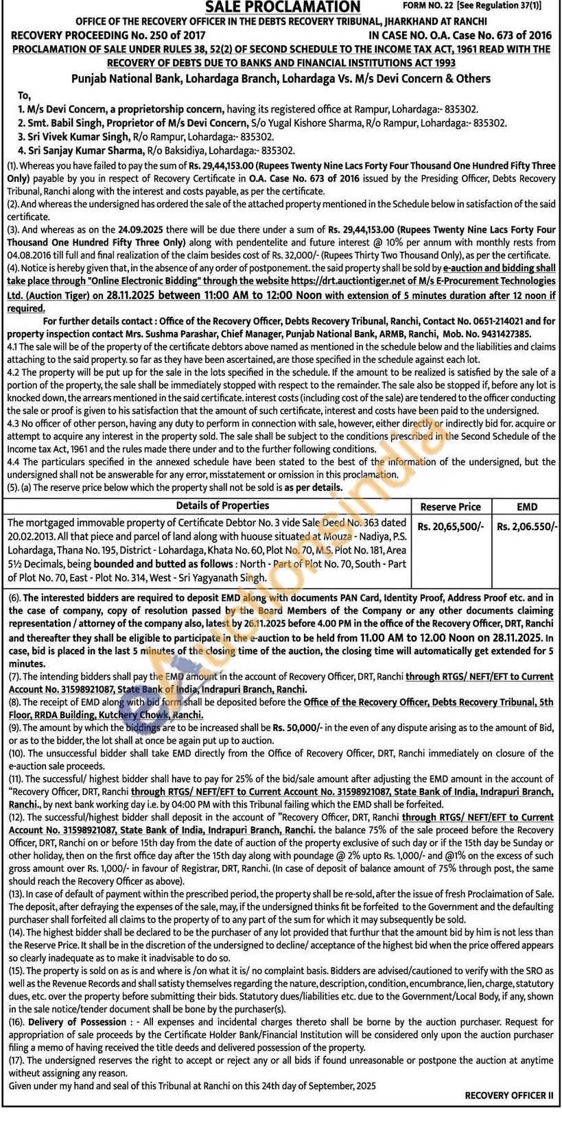 The mortgaged immovable property of Certificate Debtor No. 3 vide Sale Deed No. 363 dated 20.02.2013. All that piece and parcel of land along with huouse situated at Mouza - Nadiya, P.S. Lohardaga, Thana No. 195, District - Lohardaga, Khata No. 60, Plot No. 70, M.S. Plot No. 181, Area 5½ Decimals, being bounded and butted as follows: North - Part of Plot No. 70, South - Part of Plot No. 70, East - Plot No. 314, West - Sri Yagyanath Singh