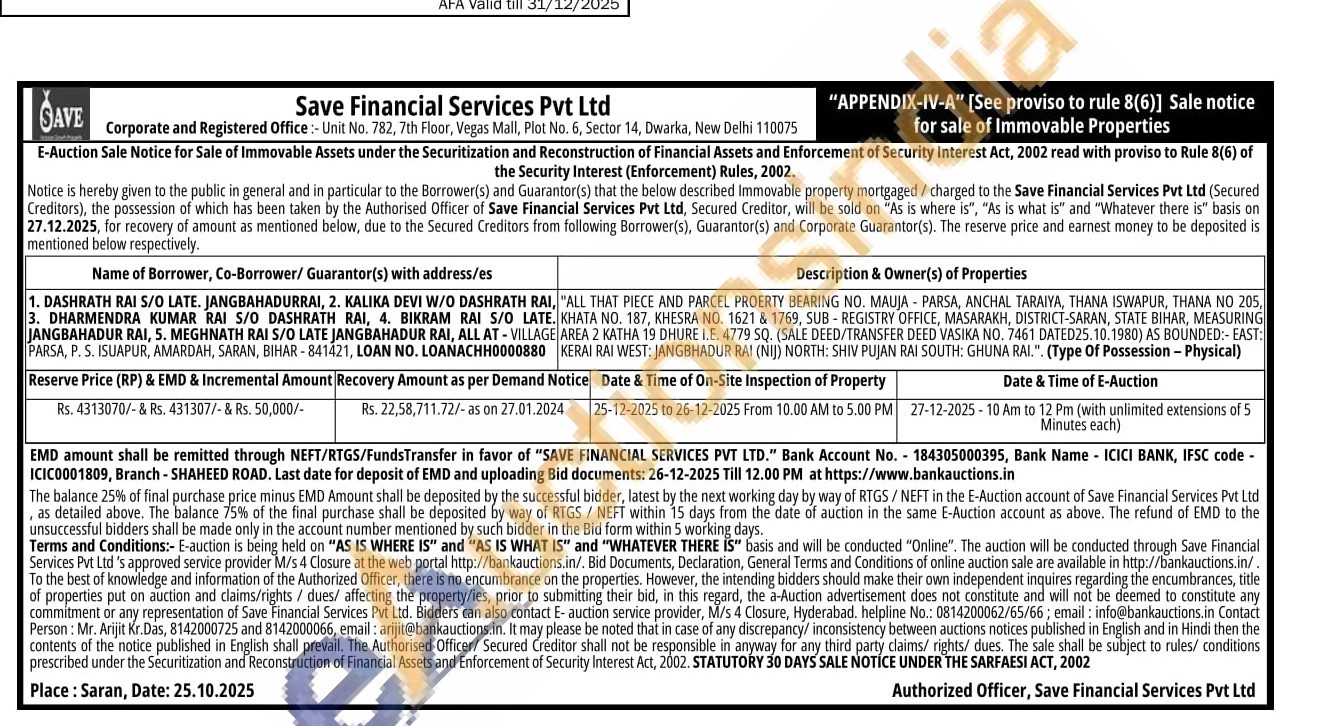 ALL THAT PIECE AND PARCEL PROERTY BEARING NO. MAUJA PARSA, ANCHAL TARAIYA, THANA ISWAPUR, THANA NO 205 KHATA NO. 187, KHESRA NO. 1621 & 1769, SUB-REGISTRY OFFICE, MASARAKH, DISTRICT-SARAN, STATE BIHAR, MEASURING AREA 2 KATHA 19 DHURE 1.E. 4779 SQ. (SALE DEED/TRANSFER DEED VASIKA NO. 7461 DATED25.10.1980) AS BOUNDED:-EAST: KERAI RAI WEST: JANGBHADUR RAI (NIJ) NORTH: SHIV PUJAN RAI SOUTH: GHUNA RAI.". (Type Of Possession - Physical)