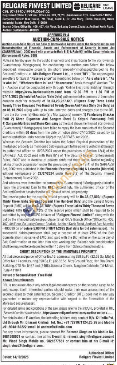 All that piece and parcel of Office No. 16, admeasuring 350 Sq.Ft. (32.52 Sq. Mtr) & Office No.17 admeasuring 350 Sq. Ft. (32.52 Sq. Mtr) Ground Floor, Hari Om Shanti Building, CTS No. 5467 and (5468) Jijamata Chowk, Talegaon Dabhade, Tal-Maval, Pune-411041