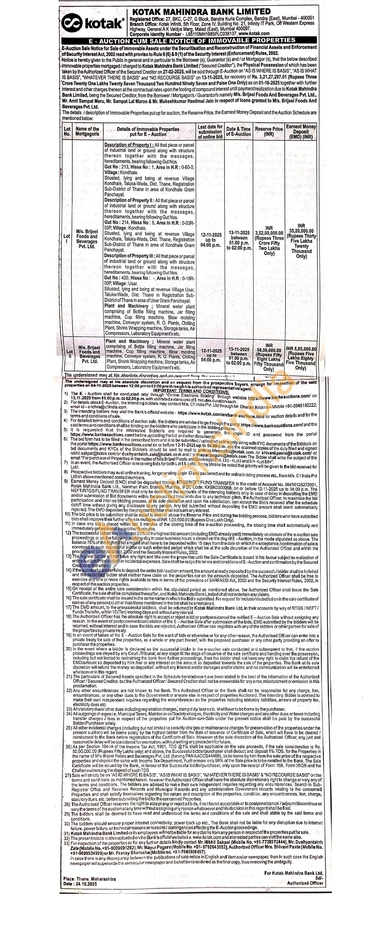 Authorized Officer Mrs. Shivani Paste (Mobile No. +91-9699534999) or Mr. Pranay Bharucha (Mobile no. +91-7045928097).