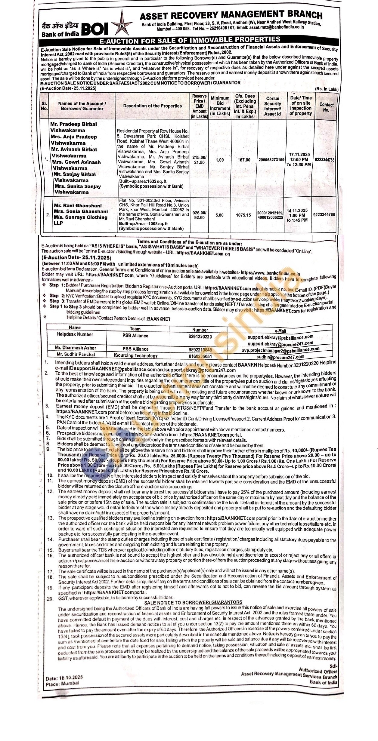 Flat No. 301-302,3rd Floor, Avinash CHS, Khar Pali Hill Road No.3, Union Park, khar West, Mumbai 400052 in the name of Mrs. Sonia Ghanshani and Mr. Ravi Ghanshani Built-up Area-1008 sq. ft (Symbolic possession with Bank)