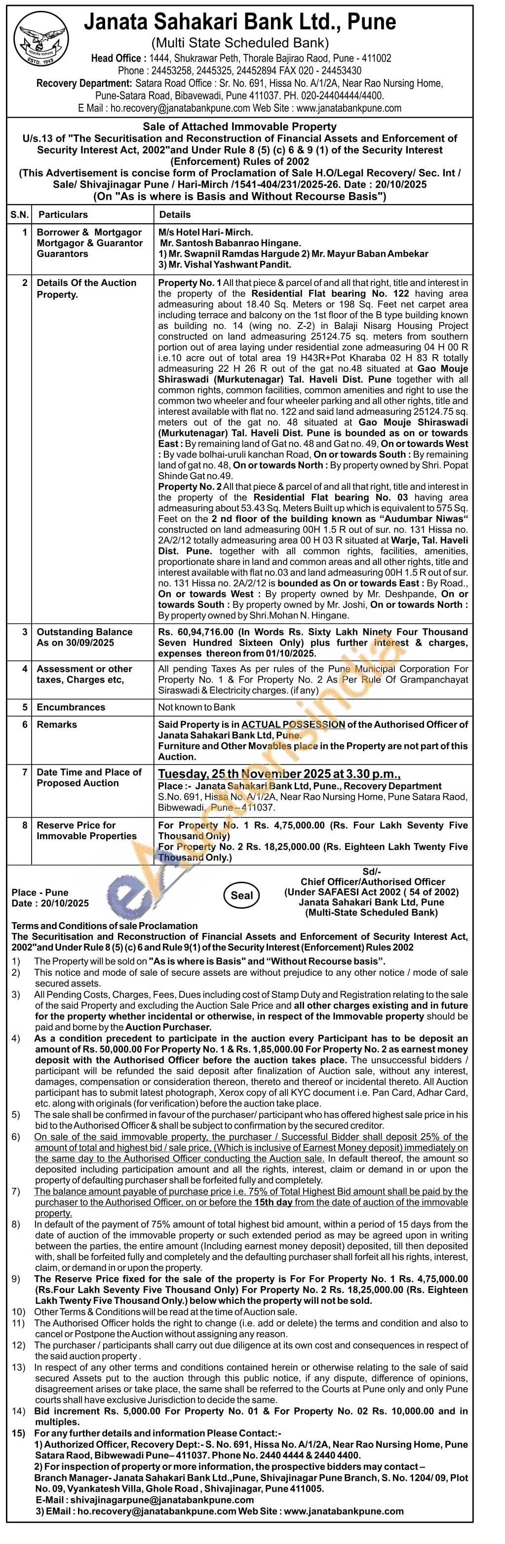 Property No. 2 All that piece & parcel of and all that right, title and interest in the property of the Residential Flat bearing No. 03 having area admeasuring about 53.43 Sq. Meters Built up which is equivalent to 575 Sq. Feet on the 2 nd floor of the building known as "Audumbar Niwas" constructed on land admeasuring 00H 1.5 R out of sur. no. 131 Hissa no. 2A/2/12 totally admeasuring area 00 H 03 R situated at Warje, Tal. Haveli Dist. Pune, together with all common rights, facilities, amenities, proportionate share in land and common areas and all other rights, title and interest available with flat no.03 and land admeasuring 00H 1.5 Rout of sur. no. 131 Hissa no. 24/2/12 is bounded as On or towards East: By Road., On or towards West: By property owned by Mr. Deshpande, On or towards South By property owned by Mr. Joshi, On or towards North: By property owned by Shri Mohan N. Hingane.