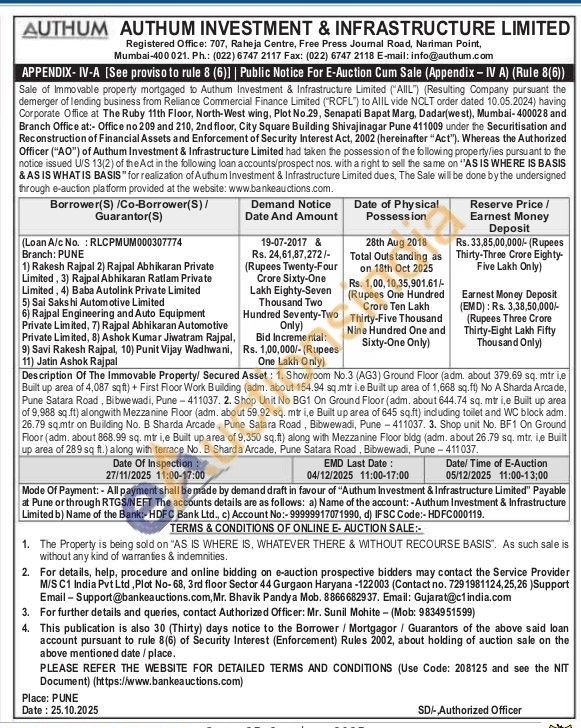 Description Of The Immovable Property/ Secured Asset: 1. Showroom No.3 (AG3) Ground Floor (adm. about 379.69 sq. mtr ie Built up area of 4,087 sqft) + First Floor Work Building (adm. about 154.94 sq.mtr ie Built up area of 1,668 sq.ft) No A Sharda Arcade, Pune Satara Road, Bibwewadi, Pune 411037. 2. Shop Unit No BG1 On Ground Floor (adm, about 644.74 sq. mtr i,e Built up area of 9,988 sq.ft) alongwith Mezzanine Floor (adm. about 59.92 sq. mtr i,e Built up area of 645 sq.ft) including toilet and WC block adm. 26.79 sq.mtr on Building No. B. Sharda Arcade, Pune Satara Road, Bibwewadi, Pune 411037. 3. Shop unit No. BF1 On Ground Floor (adm. about 868.99 sq. mtr i,e Built up area of 9,350 sq.ft) along with Mezzanine Floor bldg (adm. about 26.79 sq. mtr. i,e Built up area of 289 sq ft.) along with terrace No. B Sharda Arcade, Pune Satara Road, Bibwewadi, Pune 411037.