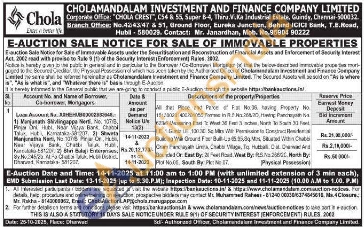 All that Piece and Parcel of Plot No.06, having Property No. 151300201400201055 Formed In R.S.No. 268/2D, Having Panchayath No. 623/6 Measuring East To West 36 Feet 3 Inches, North To South 30 Feet. I.E. 1.Gunta IE, 100.30. Sq.Mtrs With Permission to Construct Residential Building With Ground Floor Built-Up 65.95.Sq.Mtrs, Situated Within Chabbi Gram Panchayath Limits, Chabbi Village, To. Hubballi, Dist. Dharwad And Bounded On. East By: 20 Feet Road, West By: R.S.No. 268/2C, North By: Plot No.05, South By: Plot No.07. (Physical Possession)
