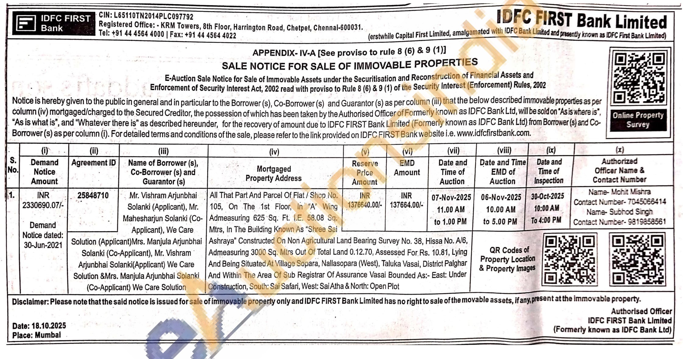 All That Part And Parcel Of Flat/Shop No. 105, On The 1st Floor, In "A" Wing 1376640.00/- 137664.00/-Admeasuring 625 Sq. Ft. LE. 58.08 Sq. Mtrs, In The Building Known As "Shree SaiAshraya" Constructed On Non Agricultural Land Bearing Survey No. 38, Hissa No. A/6, Admeasuring 3000 Sq. Mtrs Out Of Total Land 0.12.70, Assessed For Rs. 10.81, Lying And Being Situated At Village Sopara, Nallasopara (West), Taluka Vasai, District Palghar And Within The Area Of Sub Registrar Of Assurance Vasal Bounded As:- East: Under Construction, South: Sai Safari, West: Sai Atha & North: Open Plot