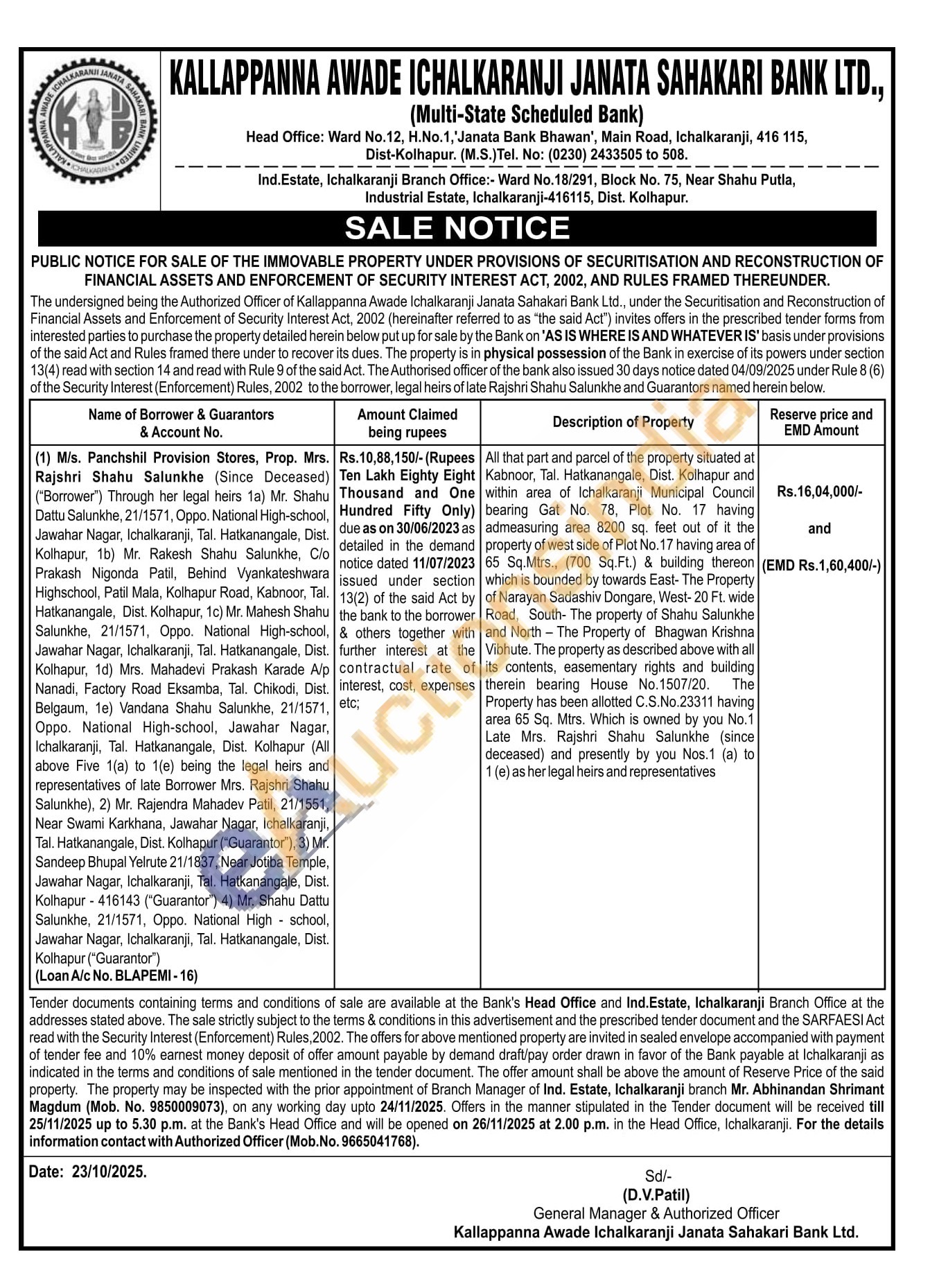 All that part and parcel of the property situated at Kabnoor, Tal. Hatkanangale, Dist. Kolhapur and within area of Ichalkaranji Municipal Council bearing Gat No. 78, Plot No. 17 having admeasuring area 8200 sq. feet out of it the property of west side of Plot No.17 having area of 65 Sq.Mtrs., (700 Sq.Ft.) & building thereon ( which is bounded by towards East- The Property of Narayan Sadashiv Dongare, West-20 Ft. wide Road, South- The property of Shahu Salunkhe and North - The Property of Bhagwan Krishna Vibhute. The property as described above with all its contents, easementary rights and building therein bearing House No.1507/20. The Property has been allotted C.S.No.23311 having area 65 Sq. Mtrs. Which is owned by you No.1 Late Mrs. Rajshri Shahu Salunkhe (since deceased) and presently by you Nos.1 (a) to 1 (e) as her legal heirs and representatives