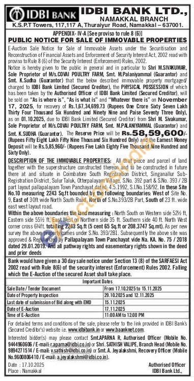 DESCRIPTION OF THE IMMOVABLE PROPERTIES: All that piece and parcel of land together with the super structure constructed thereon and to be constructed in future there at and situate in Coimbatore South Registration District, Singanallur Sub-Registration District, Sulur Taluk, Otterpalayam Village, S.No. 392 part & S.No. 393/28 part layout pallapalayam Town Panchayat dated: 4.5.1992, S.I.No. 158/92. In these Site No.10 measuring 2243 Sq.ft bounded by the following boundaries: West of Site No. 9. East of 30ft wide North South Road, North of S.No.393/2B Part, South of 23 ft. wide east west layout road