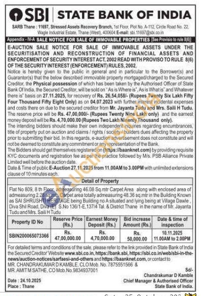 Flat No 809, 8 th Floor, admeasuring 46.08 Sq.mir Carpet Area along with enclosed area of admeasuring 2.28 sq.mtr. Carpet area totally admeasuring 48.36 sq mir in the Buliding Known as SAI SHRUSHTI HERITAGE being Building no A situated and lying being at Village Dawle Diva Shil Road, Diva (E) S.No 136/1-E,137/4 Tal. & District Thane in the name of Mr. Jayanta Tudu and Mrs. Sali Hi Tudu