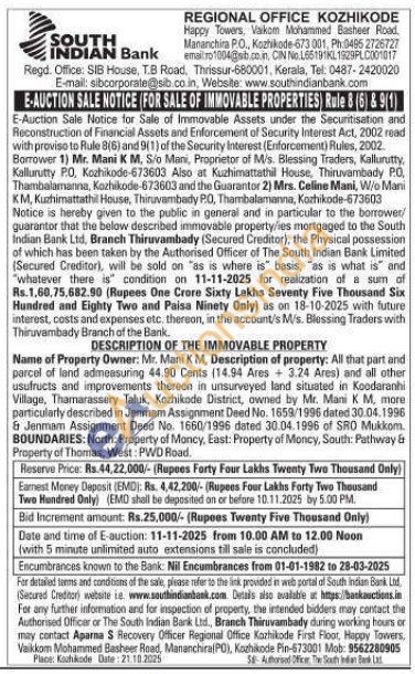 Name of Property Owner: Mr. Mani KM. Description of property: All that part and parcel of land admeasuring 44.90 Cents (14.94 Ares + 3.24 Ares) and all other usufructs and improvements thereon in unsurveyed land situated in Koodaranhi Village, Thamarassery Taluk, Kozhikode District, owned by Mr. Mani KM, more particularly described in Jenmam Assignment Deed No. 1659/1996 dated 30.04.1996 & Jenmam Assignment Deed No. 1660/1996 dated 30.04.1996 of SRO Mukkom. BOUNDARIES: North: Property of Moncy, East: Property of Moncy, South: Pathway & Property of Thomas, West: PWD Road.