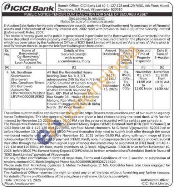 All that the Residential House bearing Door No. 6-2-7/1 admeasuring 245 Sq Yds in RS No. 737/2, Situated at Gandhi Nagar, Amalapuram, East Godavari, Andhra Pradesh bounded by East: 60-Plot of Namana Mohana Roo South: 35'- House of Nomana Mohana Rao West: 60' Plot and House of Doggumelli Rakesh Babu North: 35 Wide Road