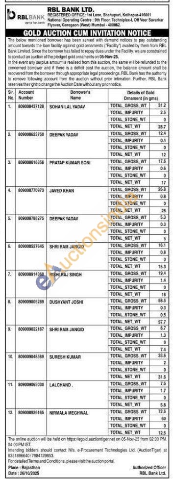 RBL Bank Gold Auctions Auction in Mumbai