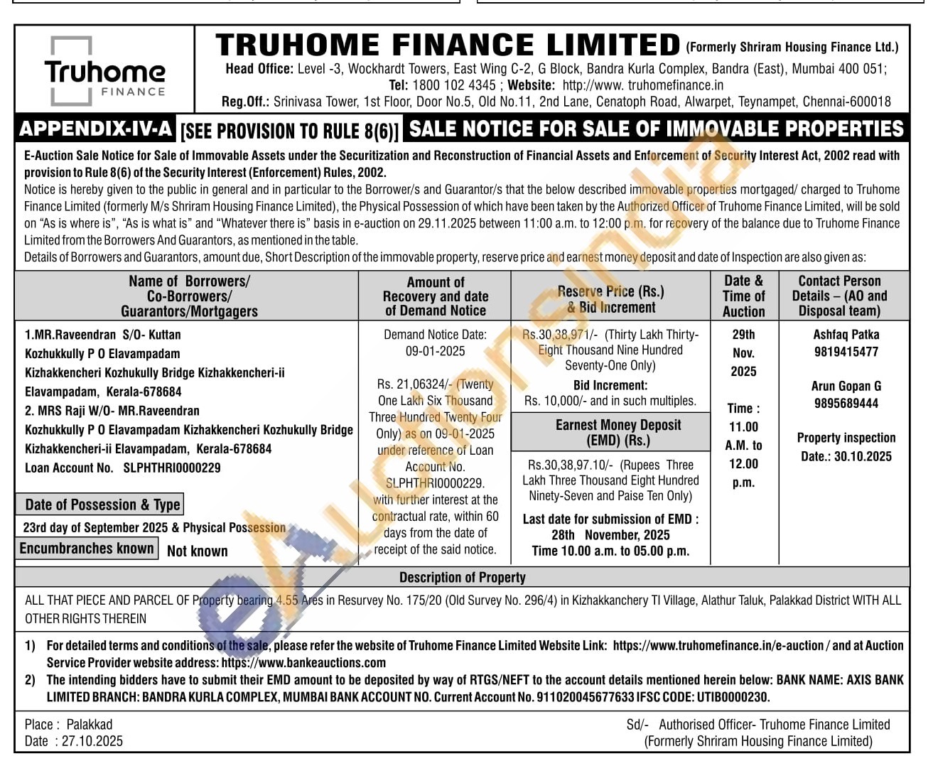 ALL THAT PIECE AND PARCEL OF Property bearing 4.55 Ares in Resurvey No. 175/20 (Old Survey No. 296/4) in Kizhakkanchery TI Village, Alathur Taluk, Palakkad District WITH ALL OTHER RIGHTS THEREIN