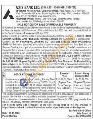 Immovable property land and building, Factory Shed constructed on land measuring 18789 Sq.mt situated at Survey No- 94 of village Magvapal of Amrel Taluka of Amreli district in the name of Shree Umiya Cotton Ginning and Pressing Private Limited