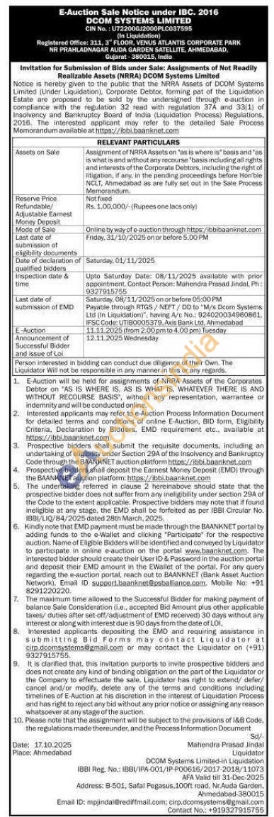 Assignment of NRRA Assets on "as is where is" basis and "as is what is and without any recourse "basis including all nights and interests of the Corporate Debitors, including the night of litigation, if any, in the pending proceedings before Hornble NCLT, Ahmedabad as are fully set out in the Sale Process Memorandum