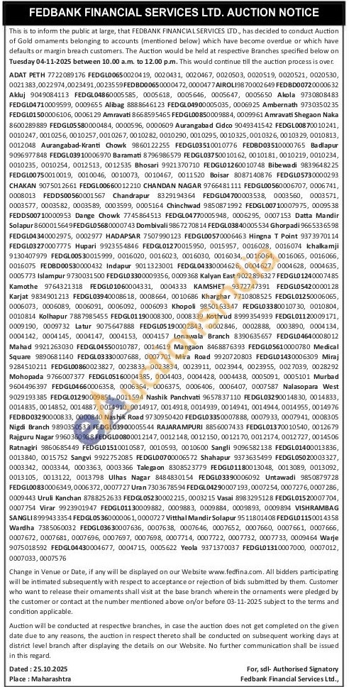 Fedbank Financial Services Ltd Gold Auctions Auction in Thrissur