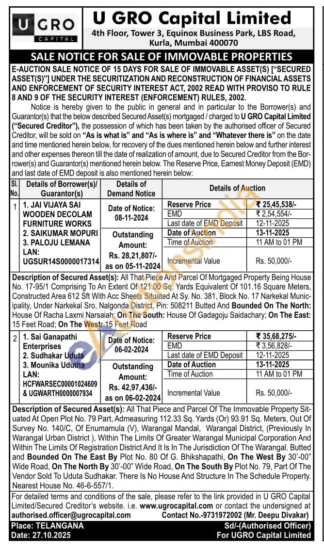 Description of Secured Asset(s): All That Piece And Parcel Of Mortgaged Property Being House No. 17-95/1 Comprising To An Extent Of 121.00 Sq. Yards Equivalent Of 101.16 Square Meters, Constructed Area 612 Sft With Acc Sheets Situated At Sy. No. 381, Block No. 17 Narkekal Munic-ipality, Under Narkekal Sro, Nalgonda District, Pin: 508211 Butted And Bounded On The North: House Of Racha Laxmi Narsaiah; On The South: House Of Gadagoju Saidachary; On The East: 15 Feet Road: On The West: 15 Feet Road
