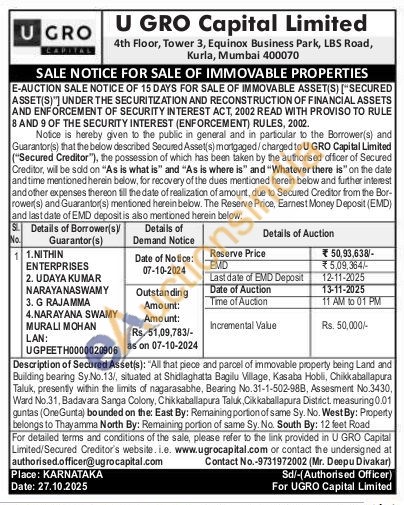 Description of Secured Asset(s): "All that piece and parcel of immovable property being Land and Building bearing Sy.No.13/, situated at Shidlaghatta Bagilu Village, Kasaba Hobli, Chikkaballapura Taluk, presently within the limits of nagarasabhe, Bearing No.31-1-502-988, Assesment No.3430, Ward No.31, Badavara Sanga Colony, Chikkaballapura Taluk, Cikkaballapura District. measuring 0.01 guntas (OneGunta) bounded on the: East By: Remaining portion of same Sy. No. West By: Property belongs to Thayamma North By: Remaining portion of same Sy. No. South By: 12 feet Road